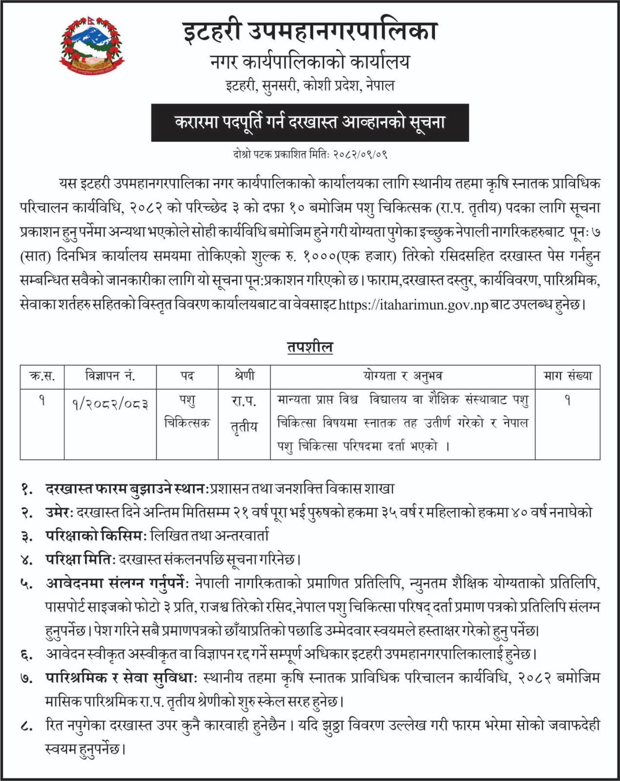 करारमा पदपूर्ति गर्न दरखास्त आव्हानको सूचना (पशु चिकित्सक २०८२।०९।०९)