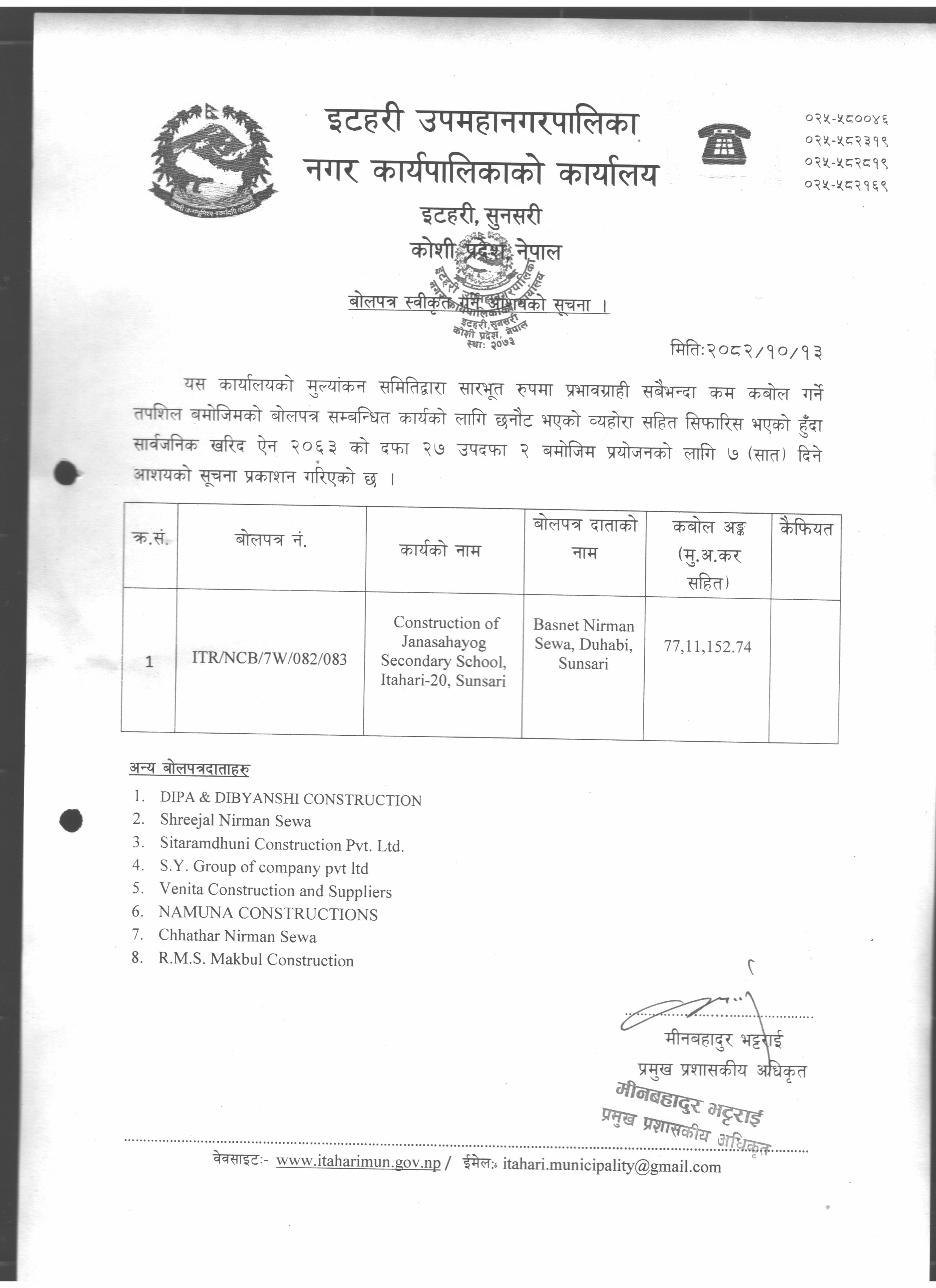 बोलपत्र स्वीकृत गर्ने आशयको सूचना !!!(२०८२-१०-१३)