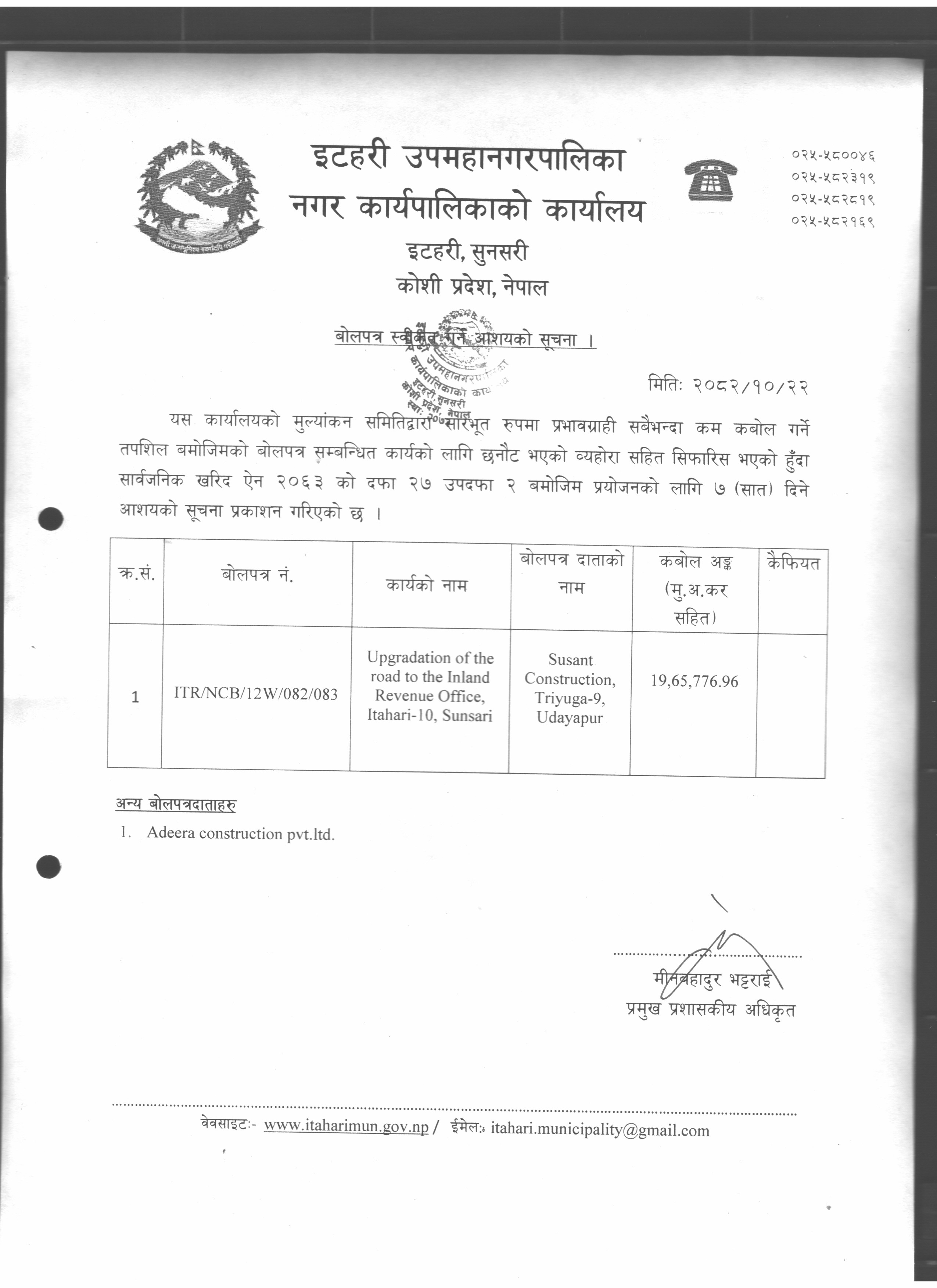 बोलपत्र स्वीकृत गर्ने आशयको सूचना (२०८२-१०-२२)
