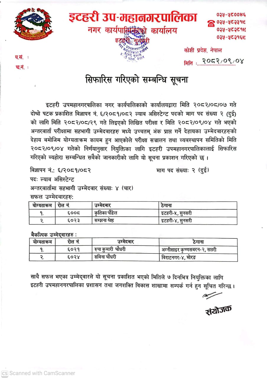 सिफारिस गरिएको सम्बन्धि सूचना (ल्याब असिस्टेन्ट- २०८२-०९-०४)
