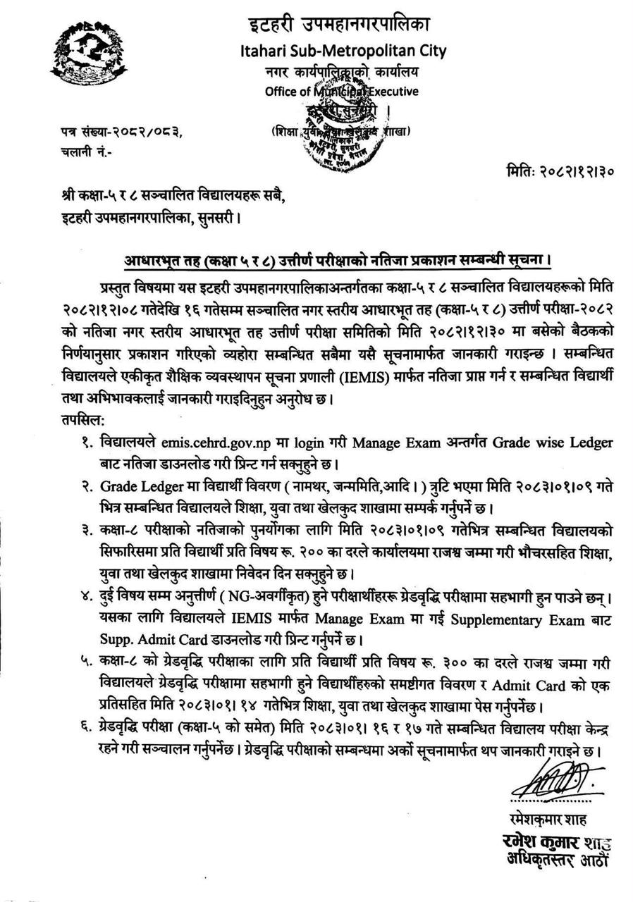 आधारभुत तह (कक्षा ५ र ८ ) उत्तिर्ण परीक्षाको नतिजा प्रकाशन सम्बन्धी सुचना !!!