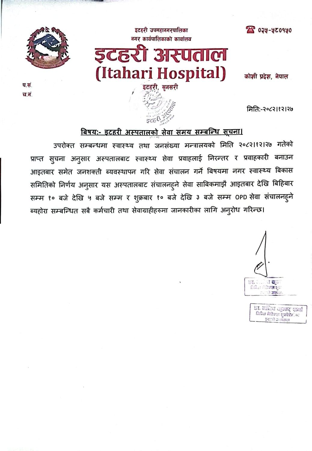 इटहरी अस्पतालको सेवा सम्बन्धि सूचना (२०८२-१२-२७)