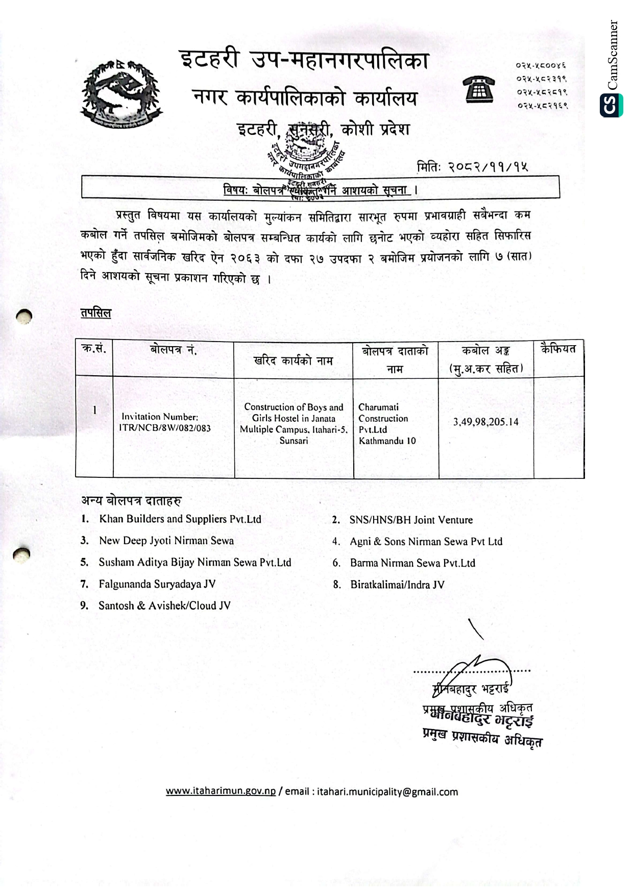 बोलपत्र स्वीकृत गर्ने आशयको सूचना (२०८२-११-१५)
