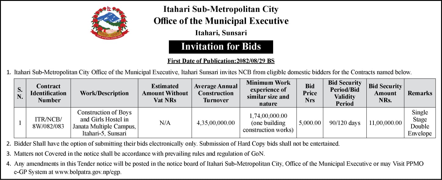 बोलपत्र स्वीकृत गर्ने आशयको सूचना (२०८२।०८।२२)