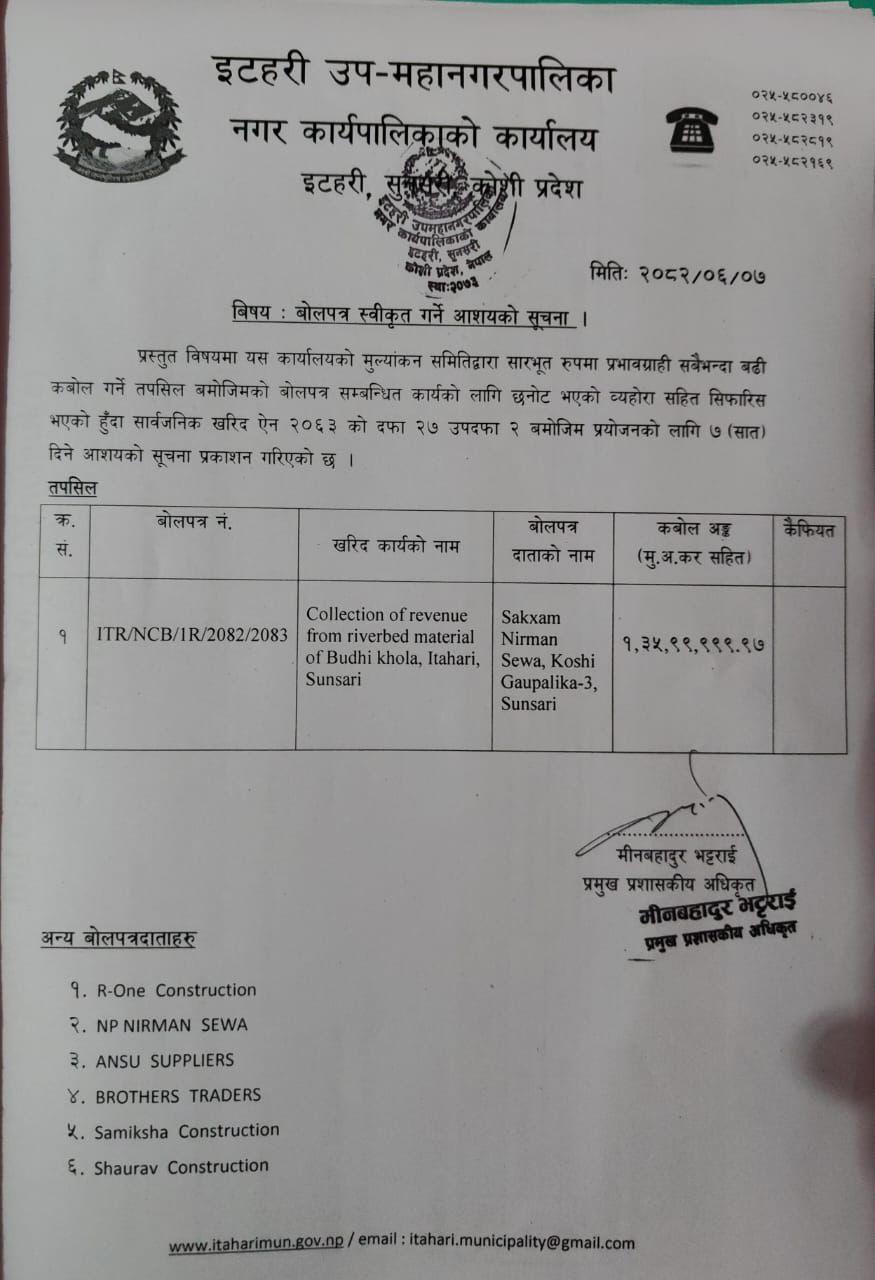 बोलपत्र स्वीकृत गर्ने आशयको सूचना !!!