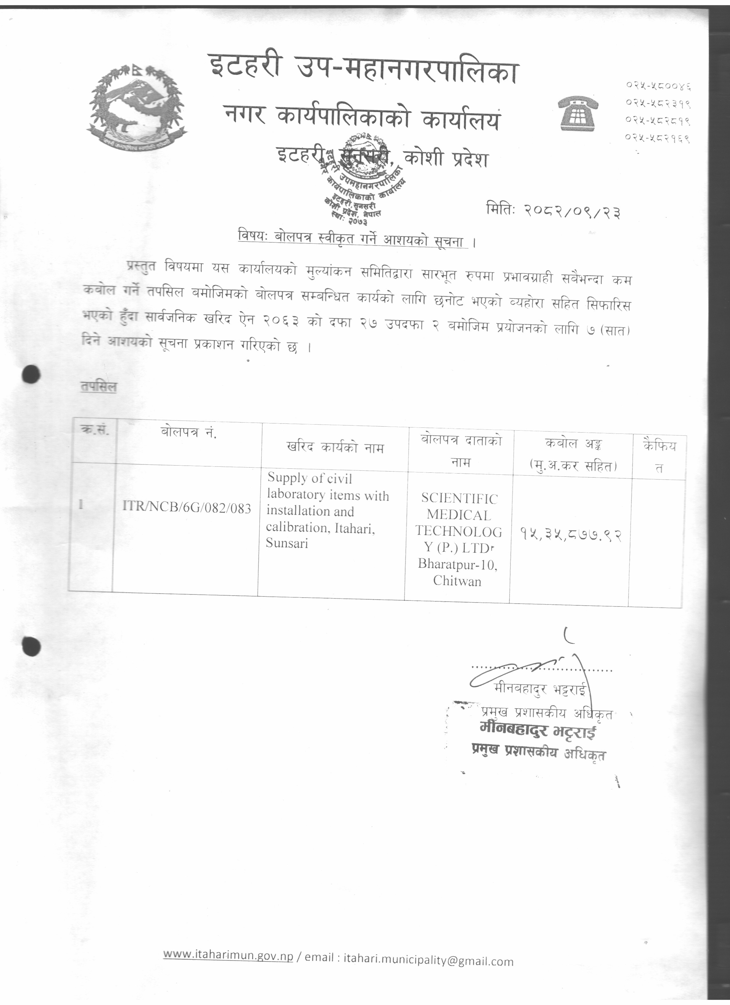 » बोलपत्र स्वीकृत गर्ने आशयको सूचना !!!
