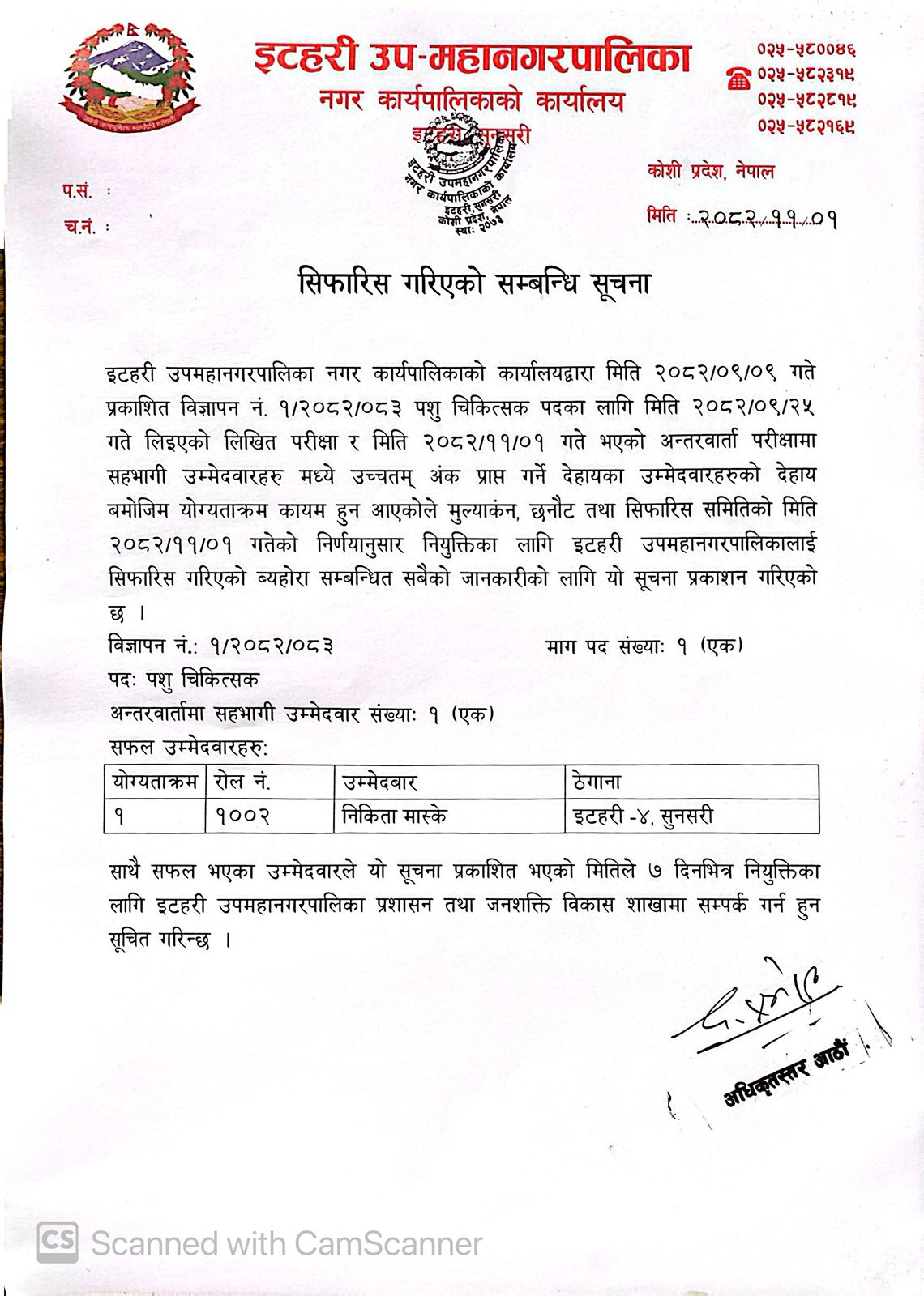 सिफारिस गरिएको सम्बन्धि सूचना (२०८२-११-०१)